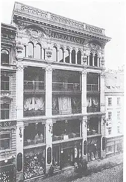 August Herzmansky (1834–1896) kam 1848 aus seiner Heimatstadt Odrau im heutigen Tschechien nach Wien und gründete 1863 ein Geschäft in der Kirchengasse 7, das Textilien anbot. Das ursprüngliche Geschäft war an der Stiftgasse 3. Alfred Gerngroß, ein ehemaliger Mitarbeiter von August Herzmansky, eröffnete im Jahr 1879 sein eigenes Stoffgeschäft unter dem Namen Gerngross. Nach kurzem Konkurrenzkampf versuchten die beiden Unternehmen zusammenzuarbeiten, dies gelang jedoch nicht, weswegen diese Verbindung 1881 wieder aufgelöst wurde. Sowohl Gerngroß wie Herzmansky versuchten in der Folge, eine dominierende kommerzielle Präsenz auf der Mariahilfer Straße aufzubauen, Gerngroß ausgehend von der Kirchengasse, Herzmansky von der Stiftgasse 1–3. Beide Unternehmen expandierten erfolgreich mit dem in Europas Großstädten damals im Vordringen begriffenen Konzept: Fixpreis und großer Umsatz durch mäßigen Aufschlag. Das „Warenhaus Herzmansky“ expandierte 1892 bereits zur Mariahilfer Straße, wurde 1897–1898 vom Architekten Maximilian Katscher (1858–1917) errichtet.[1] Der Geschäftsgründer August Herzmansky erlebte die Eröffnung jedoch nicht mehr, er starb kinderlos am 5. Dezember 1896 und wurde auf dem Hadersdorfer Friedhof (Abt. 2, Nr. 39) beigesetzt.