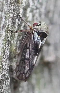 Die Zikaden werden 4,9–5,5 mm lang.[1] Sie sind überwiegend grau-schwarz gefärbt. Die Vorderflügel sind mit deutlichen schwarzen Adern durchzogen. Die Facettenaugen sind rötlich. Die Art weist einen Geschlechtsdimorphismus auf. Der Vorderrand des Pronotums ist bei den Männchen schwarz-gelb gefleckt. Das Gesicht der Männchen ist gelb gefärbt und weist im oberen Bereich eine schwarze Strichzeichnung auf. Das Gesicht der Weibchen ist dagegen bräunlich gefärbt und weist einen herzförmigen dunklen Fleck im unteren Bereich auf.[2] Das Scutellum (Schildchen) der Männchen ist dunkel mit zwei gelben Flecken an der Seite, während das der Weibchen überwiegend braun gefärbt ist.[2]