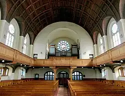Über der Eingangshalle steht die Ladegast-Orgel. Darüber befindet sich ein rosenförmiges Fenster mit Engelsmotiven. Das Langhaus hat eine an drei Seiten umlaufende, vorkragende hölzerne Empore, die mit Ornamenten verziert ist. Im Altarraum stehen der Sandsteinaltar sowie die verzierte hölzerne Kanzel und die Loge des Herzogpaars. Die Kirche wird im Altarraum abgeschlossen mit drei Bleiglasfenstern, auf denen die Himmelfahrt Christi mit den zwölf Jüngern abgebildet ist.