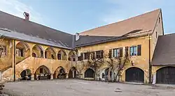 Der Hof ist mit einer hohen Mauer gegen die Burggasse geschlossen. Über der Einfahrt ist ein Wappenstein mit Bindenschild und Kärntner Wappen von 1524 angebracht.