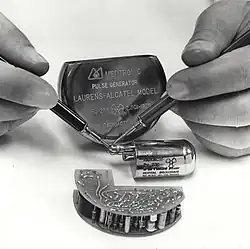 Da die ersten Schrittmacher nur kurze Batterielaufzeiten hatten, wurden danach Schrittmacher mit Radionuklidbatterie als radioaktive Energiequellen, welche die benötigte elektrische Energie aus der Zerfallswärme von etwa 200 Milligramm Plutonium 238Pu gewannen, implantiert.[19] Diese „Atomschrittmacher“ wurden beim Menschen erstmals 1971 in Frankreich[20] und zwischen 1971 und 1976 auch in Westdeutschland Patienten implantiert. Einige waren 2009 noch im Einsatz.[21] In der Sowjetunion wurden Plutonium-Herzschrittmacher noch bis Mitte der 1980er Jahre implantiert.