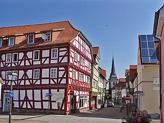 in der Landgrafenstraße: gotische evangelische Pfarrkirche[25] aus dem 14. Jahrhundert und das Rathaus von 1656 mit dem städtischen Wahrzeichen am Giebel,