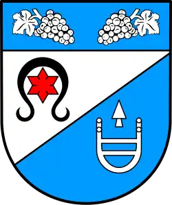 Blasonierung: „Unter blauem Schildhaupt, darin zwei schräggestellte beblätterte silberne Trauben. Darunter von Silber und Blau schräglinks geteilt, die alten Ortswappen der ehemaligen Gemeinden; oben das Heuchelheimer Wappen: ein schwarzer Kesselhaken, in dessen Bogen ein schwebender sechsstrahliger roter Stern; unten das Klingener Wappen: ein silbernes Gemarkungszeichen in Form eines großen U, dessen Schenkel durch zwei Balken verbunden und am oberen Ende mit je zwei Kugeln besetzt sind, darüber eine schwebende spitze silberne Pflugschar.“ |