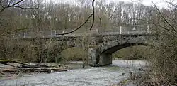 Die Brücke in Verlängerung der Straße „Zum Schulwald“ wurde 1888 als französische Reparationsleistung für den Deutsch-Französischen Krieg mit drei Segmentbögen errichtet. Das Bauwerk ist weit gestreckt, um das an dieser Stelle sehr breite Bachbett zu überqueren und die Mühle sowie Teile der Feldgemarkung mit dem Dorf zu verbinden. Die Verkleidung besteht aus regionaltypischem Basalt in kleiner Steingröße. Die Brückenpfeiler sind auf der stromaufwärts gewandten Seite mit Brechern versehen, die flache Kapitelle und eine Verkleidung aus größeren Basaltquadern tragen.