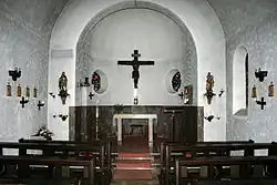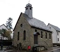 Das kleine Gotteshaus wurde 1948 in dem zu dieser Zeit bereits unüblichen neuromanischen Stil errichtet. Entsprechend handelt es sich um eine kleine Hallenkirche. Das Mauerwerk wurde aus dem regionaltypischen Basalttuff gefügt, der durch seine Vielfarbigkeit eine rustikale Wirkung erzielt. Der Bau verfügt über eine im Gesamtverhältnis große, halbrunde Apsis mit Kegeldach und einen turmartigen Dachreiter als Glockentürmchen.