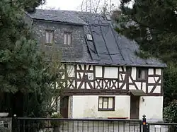 Das Wohnhaus eines Winkelhofs hat sich im kaum veränderten Ursprungszustand erhalten. Der Großteil des Fachwerks ist allerdings verkleidet. An der freiliegenden Wand des Obergeschosses sind Mannformen, genaste Schweifstreben und Schnitzwerk an den Füllhölzern zu erkennen.