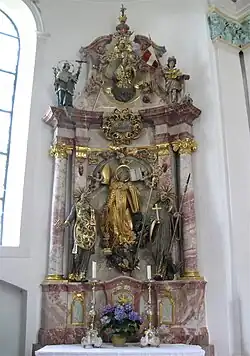 Auf dem Retabel steht unter einem Baldachin das Gnadenbild in einer Nische über dem Tabernakel[10]. Flankiert wird es links und rechts jeweils von Doppelsäulen, dem Hoheitsmotiv der Sakralarchitektur[9]. Die Dreifaltigkeit zeigt sich mit Gott Vater im Altarauszug, Jesus auf dem Arm Marias und darüber im Baldachin dem Heiligen Geist. Im Auszug befindet sich ebenfalls das Doppelwappen des Klosters Wessobrunn und des Errichters des Hochaltars, Abt Joseph Leonardi von Wessobrunn.[10]