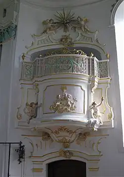 Die kleine Empore (auch Chörchen genannt) im Süden über der Sakristei (Obersakristei) dient als Kanzel, stellt aber auch ein Gegenstück zum Seitenaltar dar. Die feinen Stuckarbeiten des Wessobrunner Stuckateurs Franz Edmund Doll bilden Putten ab, die auf Kreuz, Herz und Anker als Sinnbilder für Glaube, Liebe und Hoffnung hinweisen.[13]