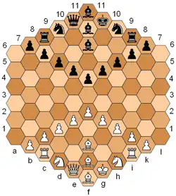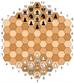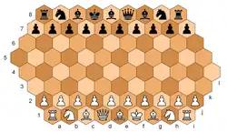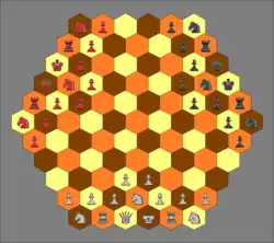 Der Figurensatz beider Spielparteien besteht in dieser Variante jeweils aus neun Bauern, zwei Springern, drei Läufern, zwei Türmen, einer Dame und einem König. Das Spielbrett ist aus 91 Feldern aufgebaut und hat die Form eines regelmäßigen Sechsecks. Die Bewegungsmöglichkeiten der Figuren werden in orthogonale und diagonale Züge unterschieden. Ein orthogonaler Zug verläuft entlang von Feldern, die jeweils eine gemeinsame Kante haben, während bei einem diagonalen Zug die Felder nicht direkt benachbart, sondern nur durch eine Linie miteinander verbunden sind. Während bei einem orthogonalen Zug auf ein unmittelbar benachbartes Feld ein Wechsel der Feldfarbe erfolgt, bleibt eine Figur bei einem diagonalen Zug stets auf der gleichen Farbe. Die orthogonalen Züge entsprechen also in der Spiellogik den waagerechten und senkrechten Zügen des normalen Schachspiels.