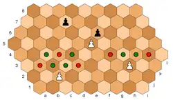 Aus der Abbildung ist zu ersehen: Der weiße Bauer auf dem Ausgangsfeld c2 hat vier Möglichkeiten zum Ziehen (grüne Punkte) und drei zum Schlagen (rote Punkte). Der weiße Bauer auf i3 hat nur zwei Möglichkeiten zum Ziehen und zwei zum Schlagen. Der weiße Bauer auf g5 und der schwarze auf h6 blockieren einander in ihrer Bewegung. Wenn aber der schwarze Bauer auf f7 nach f6 oder f5 zieht, so kann Weiß diesen Bauern schlagen, entweder direkt oder en passant, 1. … f7–f5 2. g5xf6 e.p.