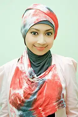 Die wohl bekannteste Variante ist die Verhüllung und Abschirmung der Frau durch ein Kopftuch. Deshalb wird unter Hidschāb häufig ein meist speziell geschneidertes, kapuzenartiges Kopftuch verstanden, das geeignet ist, Haare, Hals, Schulter- und Brustbereich mehr oder weniger ganz zu bedecken, aber das Gesicht frei zu lassen, in der Regel in Kombination mit einem lose fallenden Kleid (Abaya).[3]