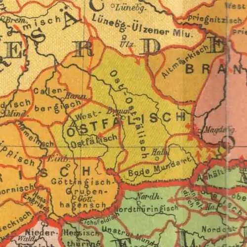 Nach Beendigung der Sachsenkriege Karls des Großen um 800 versuchte Kaiser Karl der Große, die Sachsen unter Kontrolle zu bringen, indem er zunächst Massentaufen anordnete, die jedoch von der Kirche skeptisch gesehen wurden. Ferner betrieb er eine Umsiedlungspolitik, indem er Teilstämme der Sachsen ins Innere des Frankenreiches und fränkische Siedler ins nördliche Sachsenland bis hin zur Elbe verpflanzte.[10] In jeweils neu eroberten Gebieten gründete er sogleich Grafschaften und Bistümer, um die im Frankenreich verankerte Grafschaftsverfassung auch ins nördliche und östliche Sachsenland zu bringen. Um 780 erfolgte die Gründung des Bistums Osnabrück, 788 des Bistums Bremen, 799 des Bistums Paderborn, 805 des Bistums Münster.