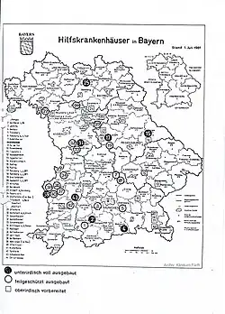 In Bayern gab es 44 Hilfskrankenhäuser.[5] Ein großer Standort war Gunzenhausen mit drei Krankenhausanlagen für insgesamt rund 1400 Personen.