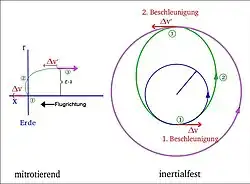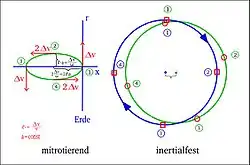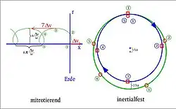 Nach einem halben Umlauf bewegt sich der Satellit im mitrotierenden Bezugssystem mit siebenfachen in die Gegenrichtung: