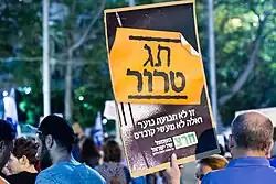 Demonstration gegen Hilltop Youths in Tel Aviv, 1. August 2015. Meretz-Plakat: „Terror-Schild [Wortspiel mit: ‚Preis-Schild‘]. Dies ist keine Jugendbewegung, und das sind keine Streiche.“