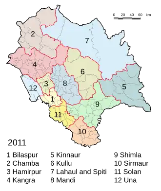 Der Bundesstaat Himachal Pradesh ist in folgende zwölf Distrikte untergliedert (Daten nach der Volkszählung 2011):[8]