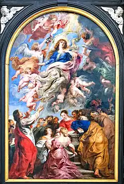 Literarische Berichte mit mehr Details, wie die Anwesenheit der Apostel, erschienen in spätmittelalterlichen Werken wie der Legenda aurea, und wurden von Künstlern aufgenommen und umgesetzt.[5][6] Nach der Reformation wurde das Motiv der Himmelfahrtsmadonna zur Stärkung katholischer Positionen eingesetzt, die von den Protestanten abgelehnt wurden.[7][8][9]