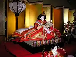 In der Zeit vor diesem Tag stellt man auf abgestufte, mit rotem Tuch überzogene Plattformen (緋毛氈 hi-mōsen) einen Satz von Puppen (雛人形 hinaningyō), die in traditionelle Kimonos gekleidet sind und die Kaiser, Kaiserin, Dienerinnen und Musiker in offizieller Hofkleidung darstellen.