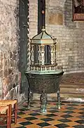 | 1473 | Bronzetaufe | Müden (Örtze) | St. Laurentius | Das Becken wird von drei Diakonen getragen. Gotische Kielbögen gliedern die Beckenwandung. Sie werden oberhalb mit Lilienornamenten verziert. In den Feldern darunter finden sich Apostelfiguren mit ihren Attributen. Ein bronzener Taufdeckel ist erhalten. | ![]() |
