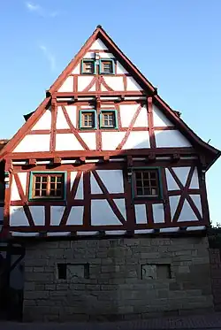 Das Haus steht mit dem Ostgiebel zur Straße und über dem massiven Erdgeschoss, mit Steinschiebefenster versehen, erhebt sich ein Fachwerkstock und zwei Dachstöcke, die überkragen. Besonders erwähnenswert ist der sparsame Einsatz der Hölzer, sodass die Gefache zur Geltung kommen. An den Eck- und Bundständern sehen wir profilierte Konsolen. Im 18. Jahrhundert wurde im rechten Winkel eine Erweiterung des Hauses angebaut.