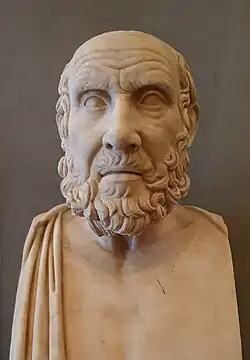 Hippokrates von Kos (griechisch Ἱπποκράτης ὁ Κῷος; * um 460 v. Chr. auf Kos, wahrscheinlich in Astypalaia/Kefalos;[1] † um 370 v. Chr. in Larisa, Thessalien[2]), kurz Hippokrates und latinisiert auch Hippocrates, war ein griechischer Arzt und Lehrer. Er gilt als der berühmteste Arzt des Altertums, dessen Schule die Theorie von vier Körpersäften im Konzept der Humoralpathologie lehrte, und zudem als „Vater der (modernen) Medizin“, der ärztliches Handeln über die Wirkungskraft priesterlicher Worte stellte und einem hohen ethischen Verantwortungsbewusstsein unterordnete. Er legte Grundlagen[3] für die Medizin als Wissenschaft, insbesondere als auf umfangreichen Beobachtungen und Beschreibung von Krankheitssymptomen fußende Erfahrungswissenschaft.[4] Von den ihm zugeschriebenen Schriften sind vor allem die Aphorismen verbreitet.