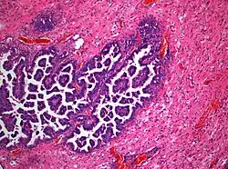 - ↑ Mazoujian et al.: Immunohistochemistry of a gross cystic disease fluid protein (GCDFP-15) of the breast. A marker of apocrine epithelium and breast carcinomas with apocrine features. In: The American Journal of Pathology. Band 110, Nummer 2, Februar 1983, S. 105–112, ISSN 0002-9440. PMID 6130702. PMC 1916150 (freier Volltext).