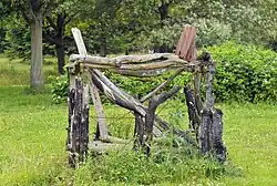 Am Eingang zum Hiroshima-Hain steht eine Kunstinstallation, die ein ausgebranntes Zuhause darstellen soll. Sie besteht aus angekohlten Baumstämmen mit einem darüber liegenden, verschmorten und deformierten Wellblechdach.