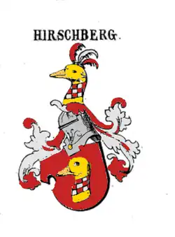 Als Wappen führten die Hirschberger im roten Schild einen goldenen Vogelrumpf mit von rot und silber geschachtem Halsband. Helmdecken: rot-silbern; Helmzier: entsprechend dem Wappenbild; Federn: rot-silber-rot.