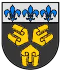 Beschreibung: „Unter silbernem Schildhaupt, darin drei blaue Lilien; in Schwarz drei mit den Spitzen im Dreipass zusammengestellte goldene Pflugscharen.“[10]
