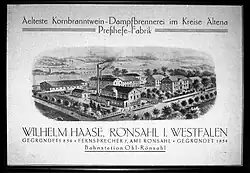 Bereits seit 1854 wurde im Ort von dem Landwirt Wilhelm Haase Alkohol hergestellt, der die Brennerei schließlich 1870/71 errichtete und dessen Familie sie bis in die 1950er Jahre betrieb. Sie kam anschließend in den Besitz des Spirituosenherstellers Krugmann aus dem benachbarten Meinerzhagen, der die Fabrik und die dazugehörige Landwirtschaft von Hanna Schröter, geb. Haase, kaufte. Die Firma Krugmann erneuerte verschiedene Anlagenteile, stellte aber bis zuletzt nach den alten Verfahren Alkohol her. 1986 wurde die Brennerei unter Denkmalschutz gestellt.