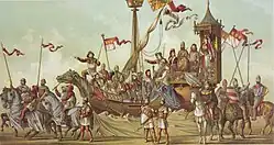 - Wagen mit der Hansekogge, Erzbischof Heinrich von Virneburg, Herzoge und Kölner Patrizier, Wagen mit dem vollendeten Domchor (Wilhelm Beckmann)
