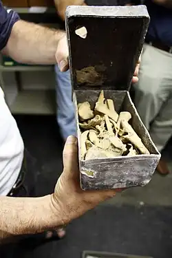 Mittelalterliches Bleigefäß mit Gebein (Reliquien) aus der Klosterkirche Groß-St-Martin