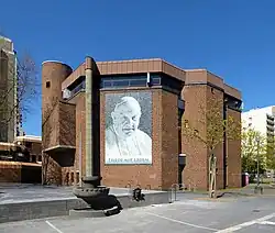 Als „kontrastierendes Rundelement“[5] ist dem Baukörper ein runder, oben flach abgeschlossener Turm, ebenfalls aus Ziegelmauerwerk, angeschlossen.