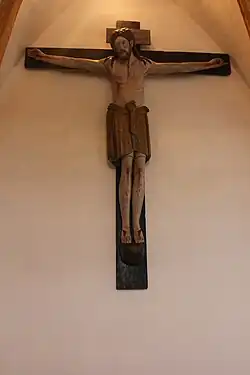 • Hochaltar mit gotischem Vortragekreuz, davor sitzende Madonna mit dem Jesuskind, links die Hl. Magdalena und rechts der Hl. Stephan. Im Tabernakel die Monstranz mit dem Kreuzpartikel