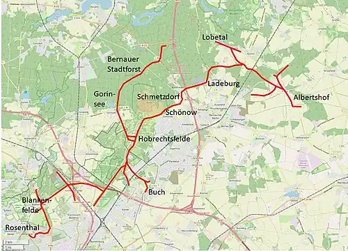In Rüdnitz und Berlin-Buch bestand Anschluss an die Bahnstrecke Berlin–Stettin und in Blankenfelde an die Heidekrautbahn (Niederbarnimer Eisenbahn).