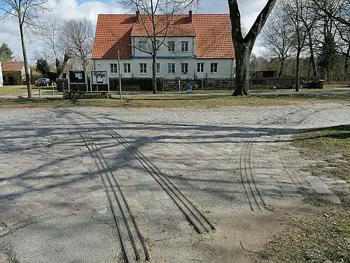 Die Feldbahn überquerte am Ende des Pölnitzweges die Straße Alt-Buch. Von dort führte eine Zweigstrecke auf der Straße Am Stener Berg bis in die Sandgruben und wohl eine weitere bis zum Küchenhaus des Alte-Leute-Heimes.[7]