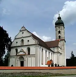 An der südlichen Längsseite ist ein kleiner Eingangs-Vorbau mit Figurennische im geschweiften Giebel angefügt, und über diesen ist an der Langhauswand ein Wappen angebracht, das von der baulichen Erneuerung 1734 zeugt. Die Inschrift lautet: "SVB AVSPICIO REGIMINE ILLVST(RI) D(OMINI) D(OMINI) / MAXIMIL(IANI) MARIAE S(ACRI) R(OMANI) I(MPERII) DAPI(FERI) E(T) COMITIS / DE WOLFFEGG WALDSEE ECCLE/SIA HAEC FVIT RENOVATA 1734" - unter der Verantwortung und der Regierung des vornehmen Herrn, des Herrn Maximilian Maria, des Heiligen Römischen Reiches Truchseß und Graf von Wolfegg-Waldsee, wurde diese Kirche 1734 erneuert. Bei dem Genannten handelt es sich um Erbtruchseß Maximilian Maria Graf von Waldburg zu Wolfegg (geb. 1684, gest. 1748) aus der Linie Waldburg-Wolfegg-Waldsee. Der Enkel des Bauherrn wurde 1803 in den Fürstenstand erhoben und führte diese Linie als Fürstenhaus Waldburg-Wolfegg-Waldsee weiter.