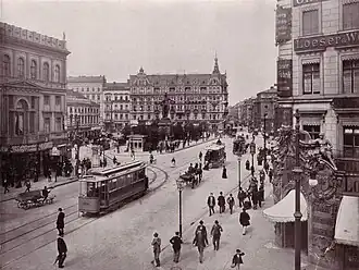 In den Großstädten, und vor allem den wuchernden neuen Städten des Ruhrgebiets, wurden die Neubauten vielfach auf Basis privater Spekulation zunächst oft wildwüchsig errichtet, ehe es Stadtverwaltungen und Kommunalpolitik gelang, strukturierend einzugreifen.[18] Während des Kaiserreichs bildete sich eine bis heute nachwirkende Stadtstruktur heraus. Der Innenstadtbereich wurde zur repräsentativen City, daneben entstanden tendenziell klar unterscheidbare Wohn- und Geschäftsgebiete, bürgerliche Wohnviertel, Arbeiterquartiere, Industriegebiete und weitere städtische Funktionsgebiete. Jedoch war das Leben in der Stadt, trotz allem Fortschritts, gerade für die unteren und mittleren Einkommensschichten vor allem von Wohnungsnot gekennzeichnet. So führte der Mangel an Unterkunftsmöglichkeiten in den Industriegebieten zu einer Zunahme der Schlafgänger. Vor allem in Großstädten wie Berlin entstanden ganze Stadtviertel aus Mietskasernen. Dagegen entstanden vor allem im Bergbau Zechensiedlungen oder Werkswohnungen für die Stammbelegschaften. Unabhängig davon, auf welche Weise auf die Wohnungsnot reagiert wurde, war damit eine soziale Segregation verbunden. Während bürgerliche Wohnviertel in städtischer Gunstlage, weit entfernt etwa von dem Gestank der Industriebetriebe entstanden, lagen die Arbeiterviertel meist in Ungunstlagen.[19]