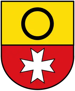 Blasonierung: „Von Gold und Rot geteilt, oben ein schwebender schwarzer Ring, unten ein schwebendes achtspitziges silbernes Johanniterkreuz.“[14] |