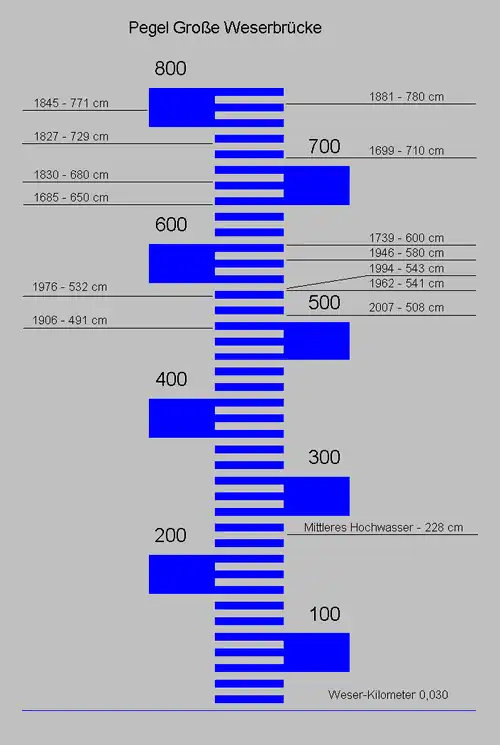 Zu den wichtigsten gehört der Pegel an der Großen Weserbrücke im Zentrum der Stadt. Er befindet sich auf der linken Weserseite auf der Halbinsel Teerhof an der Straße Herrlichkeit. Seine Daten können zwar nicht als allgemeinverbindlich für alle Weserufer Bremens angesehen werden, sind aber in der Regel als Richtwerte gesetzt. Ergeben sich Abweichungen vom mittleren Hochwasser, so gelten die jeweils bekanntgegebenen Werte in Bremen für diesen Pegel. Über diese Abweichungen wird die Bevölkerung in den Radionachrichten und im Internet informiert. Da in den meisten Fällen das Hochwasser von den Gezeiten (Tide) bestimmt wird, lautet die fachliche Bezeichnung Tidehochwasser (Thw). In neuerer Zeit liegt das mittlere Hochwasser bei 2,56 Meter.[4] Das mittlere Niedrigwasser (mTnw) liegt bei 1,6 Metern unter Normalhöhennull. Der mittlere Tidenhub beträgt somit 3,88 Meter. An diesem Pegel beträgt der mittlere Durchfluss bei mittlerer Tide 327 Kubikmeter pro Sekunde. Er kann in Extremfällen auf bis zu 180 Kubikmeter fallen, aber auch auf 1200 Kubikmeter steigen.