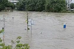 Ebenfalls betroffen war die Schweiz: Starke Regenfälle vor allem am Samstag, den 1. Juni und am Montag, den 3. Juni führten u. a. dazu, dass Flüsse und Seen hochstiegen; es gab Hochwasseralarm an der Sitter und der Goldach in der Ostschweiz, am Bodensee und am Hochrhein galt Gefahrenstufe 3 (erhebliche Gefahr), am Untersee am 4. Juni Gefahrenstufe 4 (große Gefahr).[81] Im Laufe des Monats kam es in der Schweiz nach wiederholt heftigen Niederschlägen noch zu mehreren weiteren teils schweren Überflutungen.