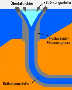 Eine andere Konstruktionsart an Staudämmen ist der Hochwasserentlastungsturm. Dieser steht im Stauraum der Talsperre und hat häufig einen Überlauf in Form eines Überfalltrichters. Aus diesem Grund wird er auch als Kelch, Tulpe oder Trompete bezeichnet. im Englischen auch morning glory spillway genannt. Überschreitet der Wasserpegel der Stauanlage das Stauziel, strömt das überschüssige Wasser in den Überlauf ein. Durch den Turmschacht und ein anschließendes Rohr- bzw. Stollensystem wird das Wasser unter dem Staudamm hindurch zum Ablauf abgeleitet. Auf dem Rand der Überlauftulpe sind vielfach Strömungspfeiler angeordnet, die den Überlaufstrom lenken und als Strahlaufreißer wirken. Wie auch die getreppte Ausführung der Innenseite dient dies dem gezielten Eintrag von Luft in das abfließende Wasser. Damit kann der Kavitationserosion entgegengewirkt werden. Dem gleichen Zweck dient auch eine separate Belüftungsleitung, die am Turmschaft mitgeführt wird.[3]