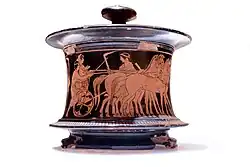 Im attischem Recht wurden zwei Formen der Eheschließung unterschieden: die gewöhnliche Verheiratung einer jungen Frau (ἐγγύησις, engýēsis) und die Verheiratung einer Witwe, die, um der Familie das Erbe zu erhalten, einen Verwandten des Verstorbenen heiraten sollte (ἐπιδικασία, epidikasia).[4] Die Eheschließung bestand aus einer Abfolge von mehrheitlich rein weltlichen Zeremonien:[5] Jeder rechtsgültigen Ehe musste eine feierliche Verlobung vorangehen, bei der auch über die Mitgift (προίξ, proíx; φερνή, phernḗ) verhandelt wurde. Vor der Vermählung, die meist im Ehemonat Gamelion stattfand, wurden den Schutzgöttern der Ehe – besonders Zeus, Hera und Artemis – Opfer dargebracht, danach mussten sowohl Braut als auch Bräutigam sich einem rituellen Brautbad (λoυτρoφóρoϛ, loutrophoros) unterziehen. Am eigentlichen Hochzeitstage wurde im Elternhaus der Braut ein Hochzeitsmahl (θοίνη γαμική, thoínē gamikḗ) ausgerichtet. Bei Einbruch der Dunkelheit führte der Bräutigam die Braut dann auf einem von Pferden gezogenen Wagen heim, dem eine Prozession der Freunde und Familien folgte; in anderen Darstellungen bewegte sich der ganze Festzug zu Fuß.[6] Im Hause der Schwiegereltern wurde die Braut von der Schwiegermutter empfangen, erhielt symbolträchtige Speisen und entschleierte sich im Thalamos des Hauses erstmals vor ihrem neuen Gatten. Die beiden folgenden Tage waren für die Entgegennahme von Hochzeitsgeschenken bestimmt.[7]