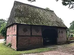 - dem eingeschossigen, giebelständigen Wohn- und Wirtschaftsgebäude von 1844 (Inschrift) als Zweiständer-Hallenhaus in gleichmäßigem Gitterfachwerk mit Steinausfachungen, reetgedecktem Krüppelwalmdach, Uhlenloch und der Grooten Door mit Korbbogen; das Innengerüst im Dielenbereich blieb erhalten, der Wohnteil wurde massiv ersetzt,[2]
