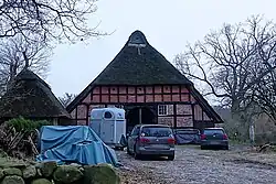 - dem eingeschossigen traufständigen, wohl ältesten Wohn- und Wirtschaftsgebäude als Zweiständer-Hallenhaus in Fachwerk mit Steinausfachungen mit reetgedecktem Krüppelwalmdach als Niedersachsengiebel mit Uhlenloch und Grooter Door; es wurde 1522 (Innengerüst, d) bzw. als Wirtschaftsgiebel 1704 (Inschrift) gebaut; ein Kammfach kam 1764 hinzu,[2][3]