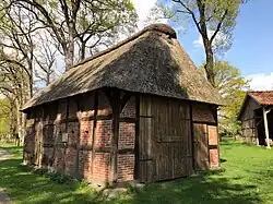 - dem eingeschossigen traufständigen Schafstall vom 18. Jahrhundert in Fachwerk mit Steinausfachungen, reetgedecktem Walmdach als Torfscheune[3]