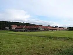 Den Eingang bildet ein romanischer, verdachter Torbau aus Bruchsteinmauerwerk an der Südseite. Sein korbbogenförmiges, ursprünglich rundbogiges Tor und die niedrige, mit geradem Sturz abschließende Pforte, beide mit Gewänden aus Lungsteinquadern, sind offensichtlich sekundär verändert. Langgestreckte, flache, massive Wirtschaftsgebäude mit gestufter Dachabfolge sind im Westen und im Südwesten der Mauer aufgesetzt, so dass hier ein äußerer Gebäudering entsteht. Eine weiter innen gelegene, hakenförmige Gebäudegruppe, die aus einem zweigeschossigen, langgestreckten Bruchsteinbau (1716), einer Bruchsteinscheune mit rundbogiger Einfahrt und einem Wirtschaftsgebäude mit Fachwerkaufsatz (19. Jahrhundert) besteht, bildet nach Nordwesten und Norden eine geschlossene Abfolge.