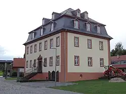 Besonders bemerkenswert ist das alle anderen Gebäude überragende, von einem barocken Mansarddach überfangene Wohnhaus. Es ist zweigeschossig, hat einen Kellersockel und zeigt kubische Form mit symmetrisch geordneten Fenstern, die auf der Hauptansichtsseite im Osten zu sieben Achsen ausgebildet sind. Auf dieser Seite liegt auch das über dem abschließenden Gesims ein von Voluten und Knorpelornamentik umschlossenes Queroval mit der Inschrift: