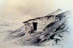 ![]() Die Hofmannshütte etwa 1900, dahinter der Großglockner | ||