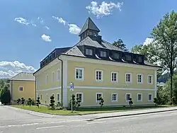 Das breit gelagerte zweigeschoßige Gebäude unter einem Walmdach zeigt Fassaden mit einer Putzrahmengliederung wohl um 1840, die Fenster im Obergeschoß haben Steingewände und zeigen eine frühbarocke gerade Verdachungen. Im Gebäudeinneren gibt es Riemlingdecken mit Unterzügen und ein Platzlgewölbe um 1840.[1]